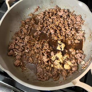 Add garlic and ginger to the oil and cook for a minute or two until fragrant. Add ground beef to the pan and use a wooden spoon to break up.