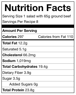 Nutrition Facts are provided as a guideline only. Exact nutrition will depend on quantity, brand and ingredients used. Nutrition facts provided for the salad with all toppings, croutons (using 3 large hamburger buns) and beef and then separately for the garlic aioli dressing.
