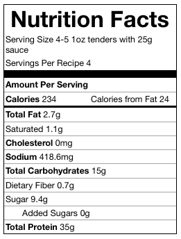 Nutrition Facts are provided as a guideline only. Exact nutrition will depend on quantity, brand and ingredients used. Nutrition fact provided for just sauce and chicken tenders with sauce.